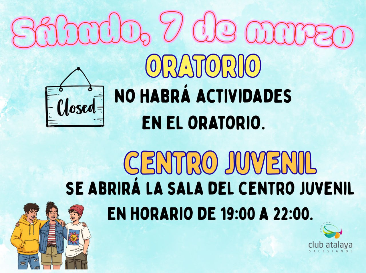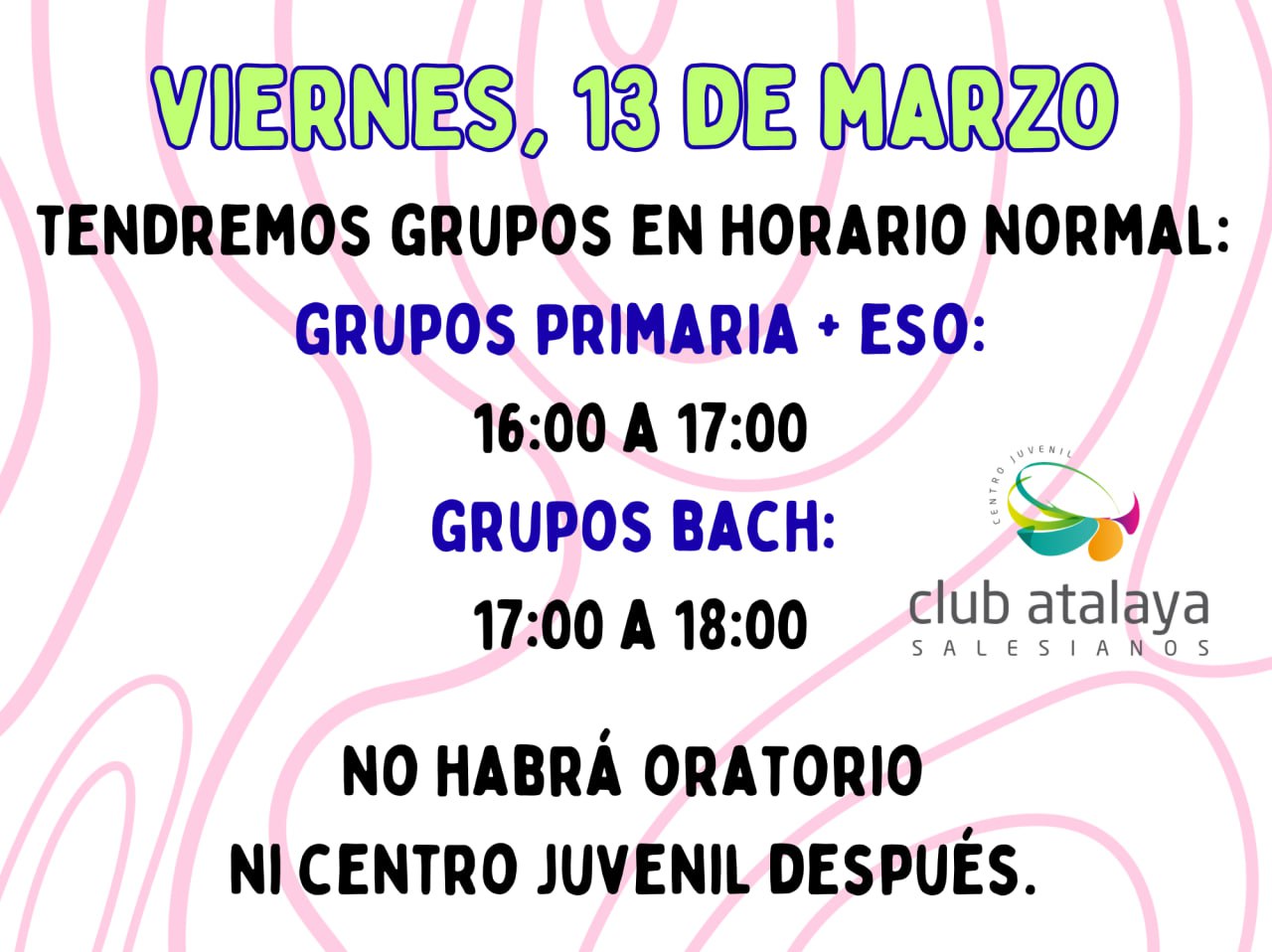 El Club Atalaya está estructurado en dos ofertas: por una parte, el ORATORIO y el CENTRO JUVENIL, y por otra parte, los GRUPOS DE ITINERARIO DE EDUCACION EN LA FE “SOMALO JOVEN”
